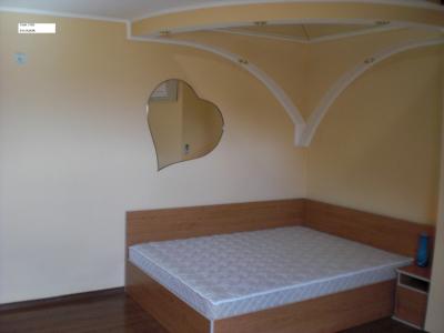 Махагонов паркет,телевизор, спалня ,ниска маса , холова гарнитура /кожа/, коридора е с обзавеждане съвременно и гранитогрес на пода.